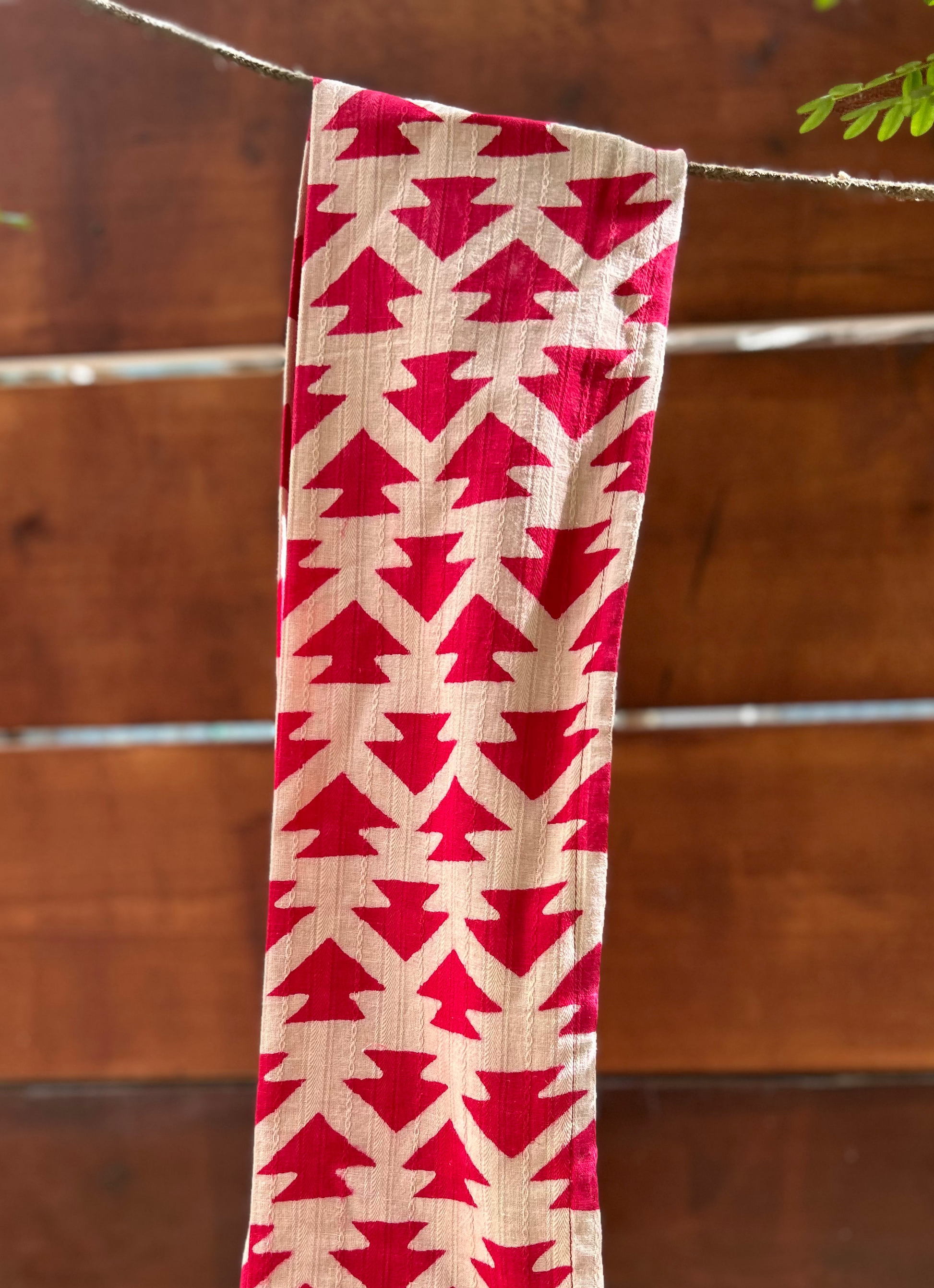 Son design graphique rouge sur fond beige apporte une touche moderne, parfaite pour un look bohème, chic ou casual.