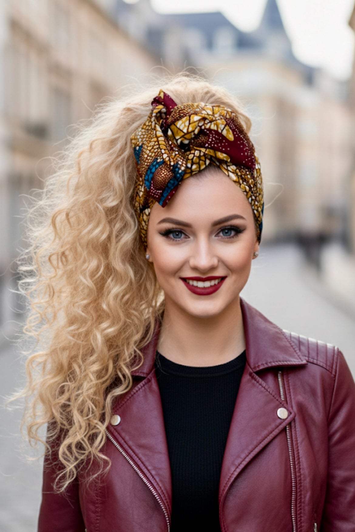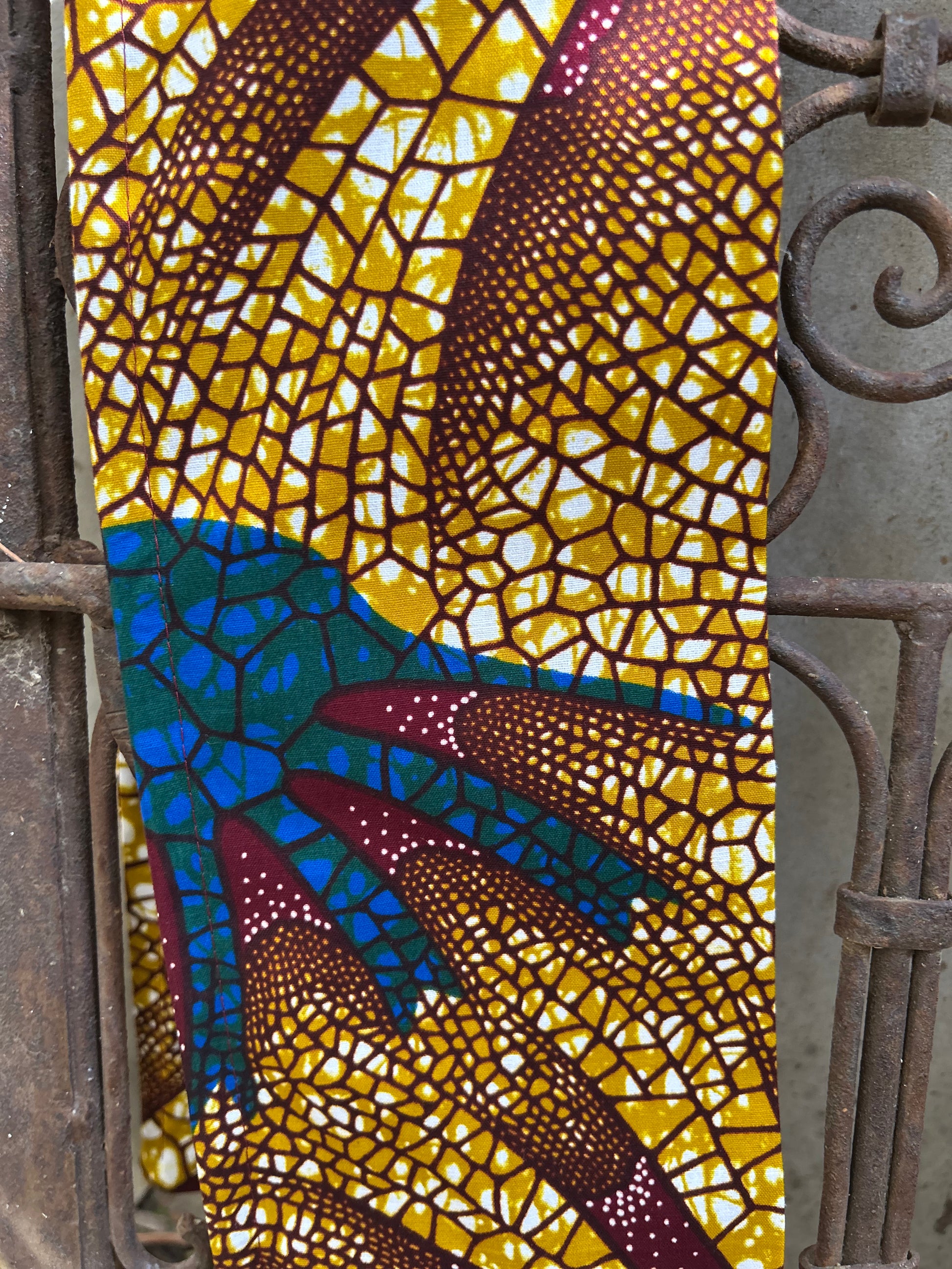 Bring a touch of boldness to your style with this flexible, adjustable headband made from authentic African print cotton wax. Its vibrant geometric patterns blend ochre yellow, deep burgundy, and touches of intense blue for a unique look.