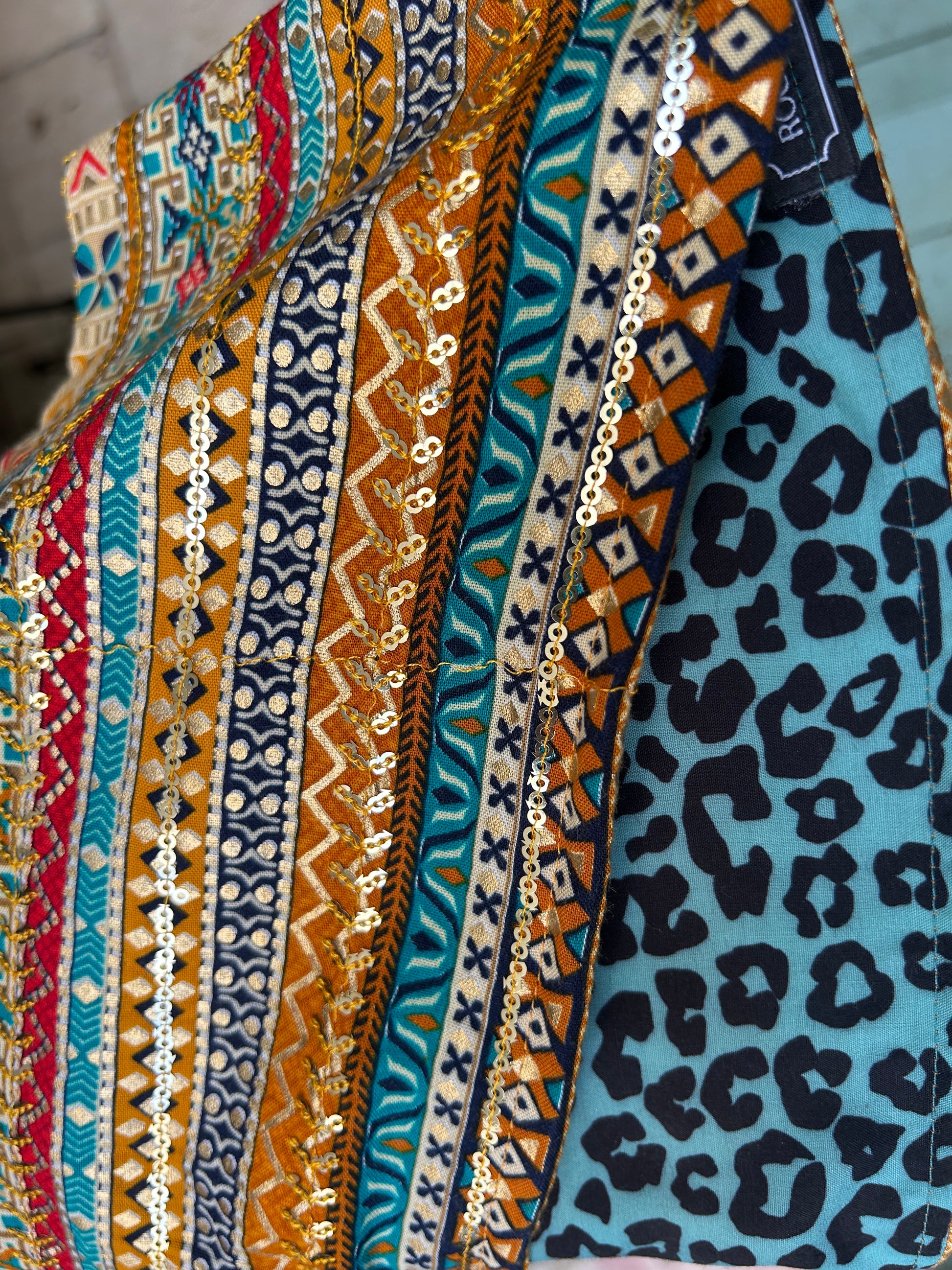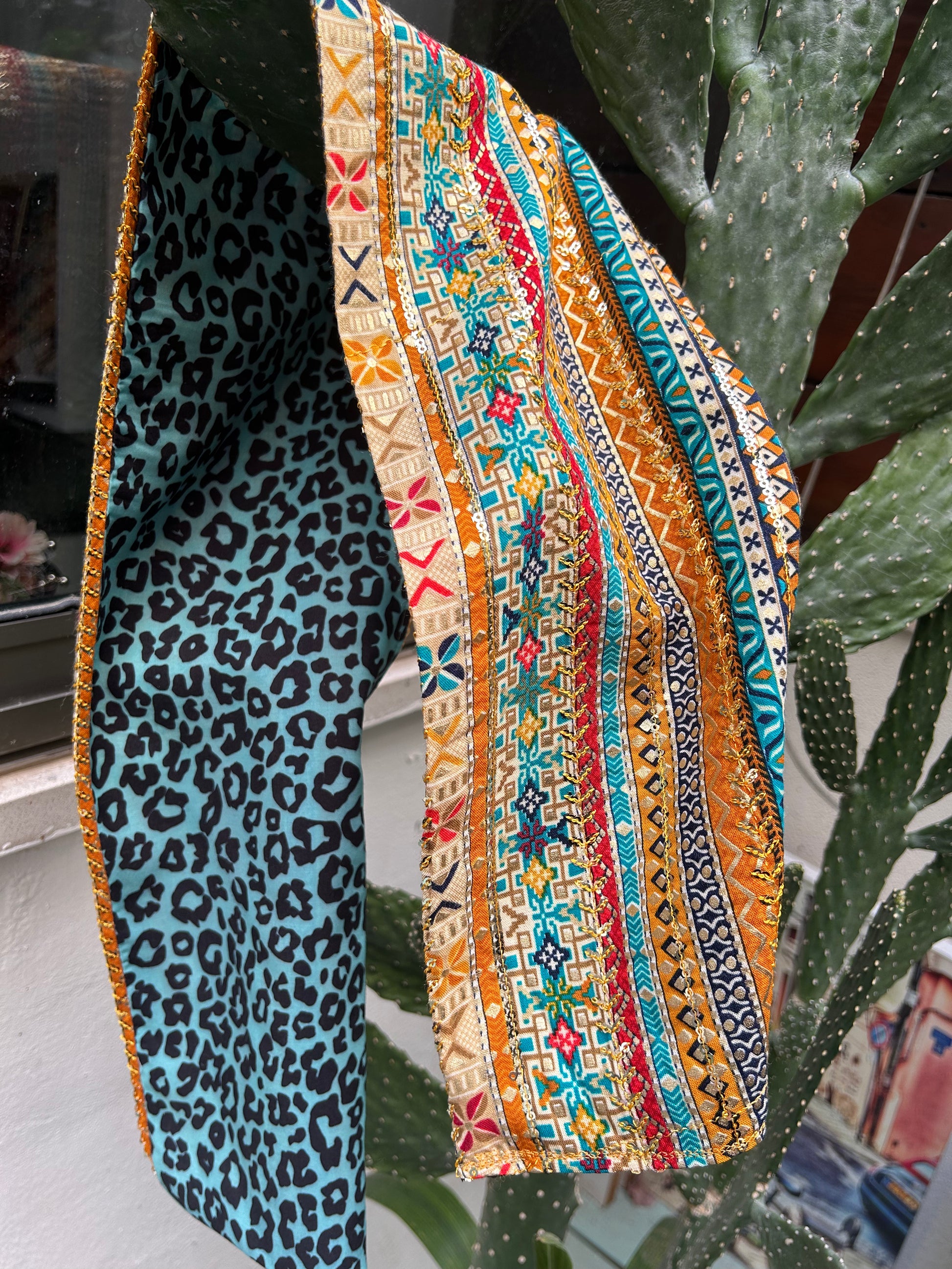 Il présente d'un côté de riches broderies dorées en patchwork pour une allure éclectique et vibrante, et de l'autre un audacieux imprimé léopard turquoise pour une touche féroce et moderne. Parfait pour ajouter une note Bohème Chic à vos tenues quotidiennes. Confortable, polyvalent, et conçu pour se démarquer. Deux looks en un !