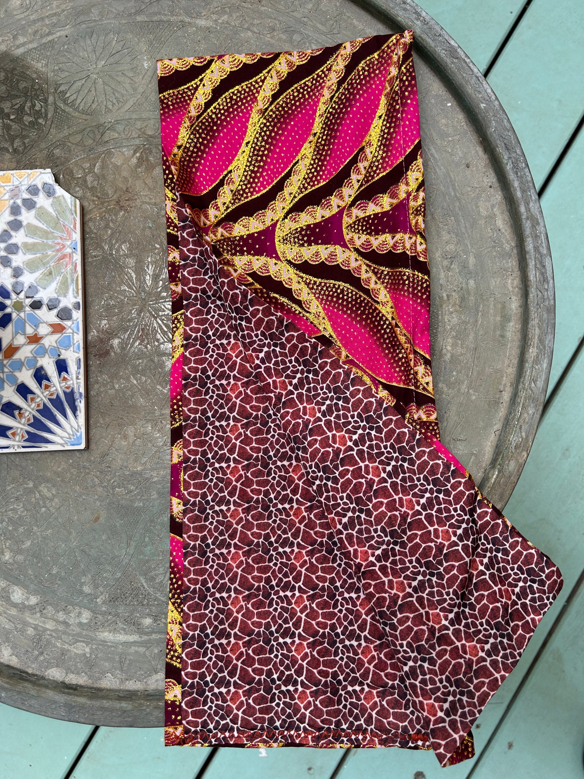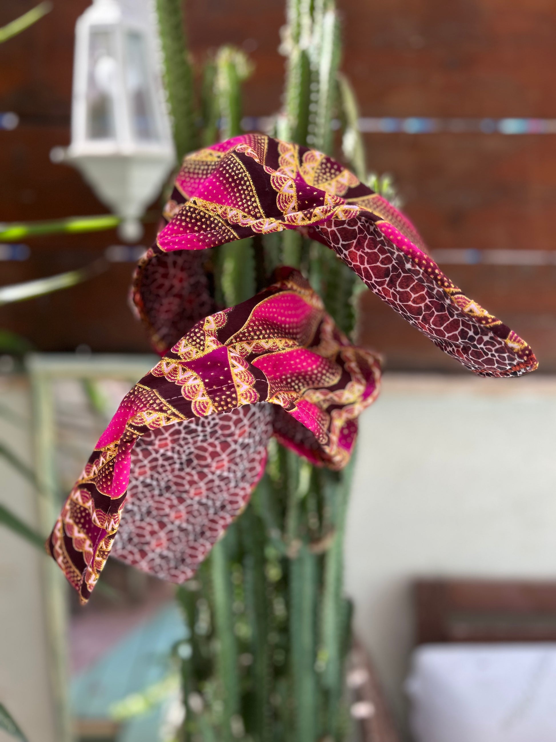 un tissu en coton wax , haute qualité glitter or ,aux nuances de fushia,violet aubergine,blanc et doré.