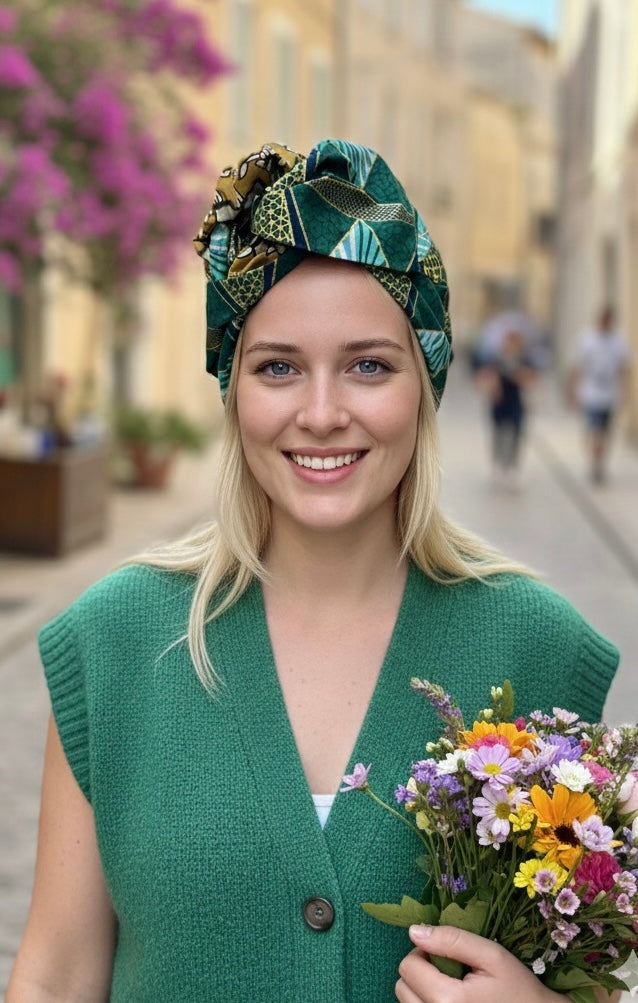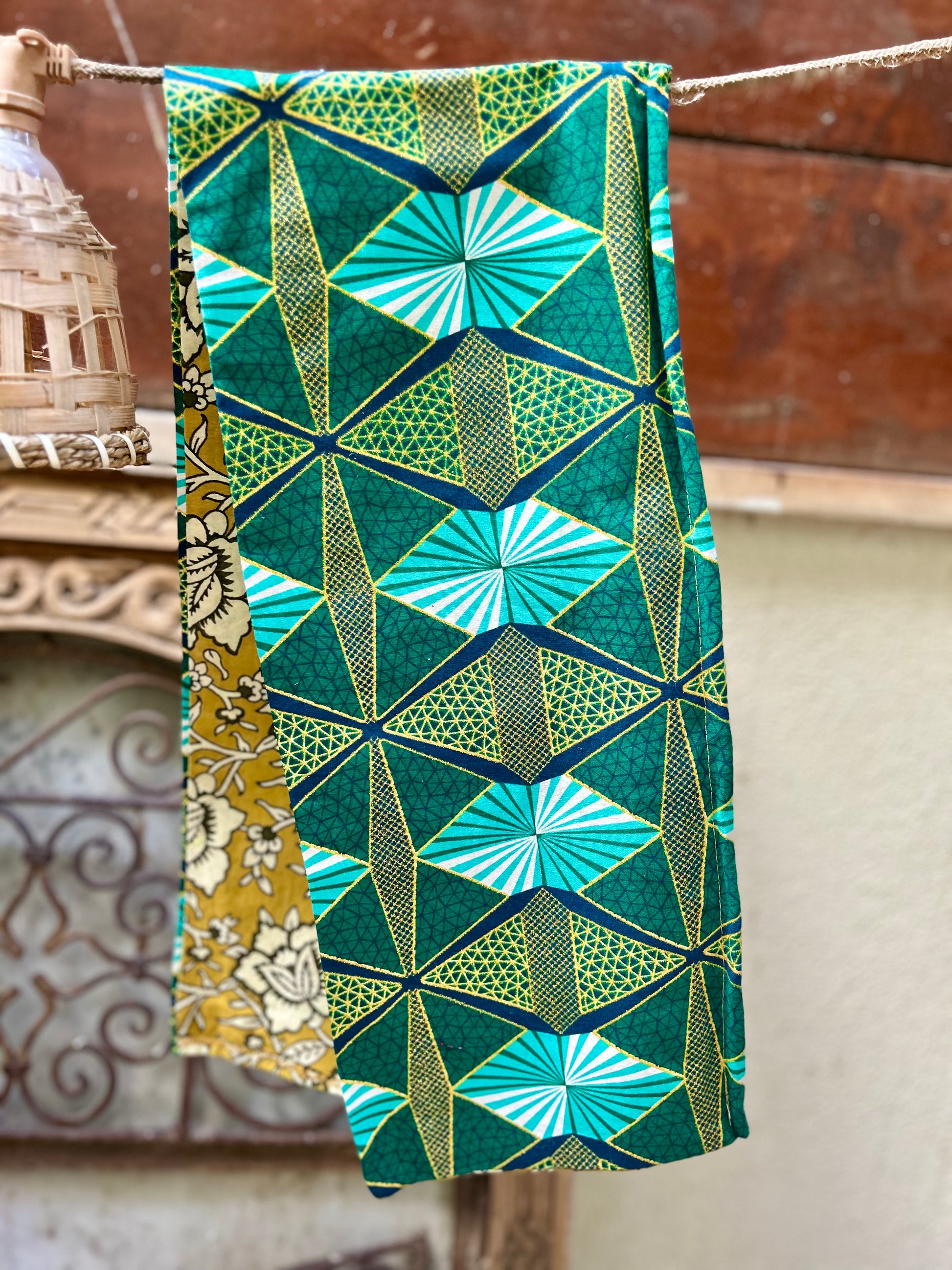 • Side 1: The Radiant African Wax Print. Showcase a dazzling side featuring a Brilliant Multi-Colored African Wax Print. This vibrant pattern explodes with rich hues—including Turquoise, Emerald Green, White, and shimmering Lurex Gold—set in striking geometric shapes and checks.